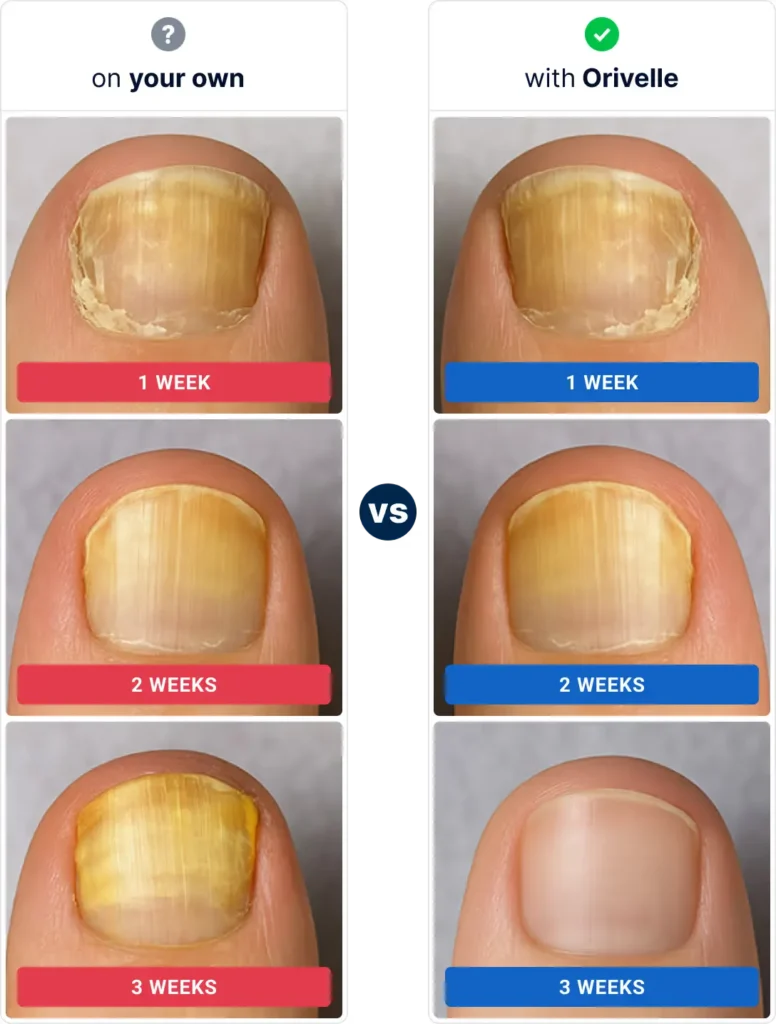 Mais lorsque Orivelle est utilisé, tout change. Sa formule naturelle à 17 ingrédients agit pour cibler la mycose à la racine, redonner aux ongles un aspect sain et aider à prévenir de futurs problèmes.